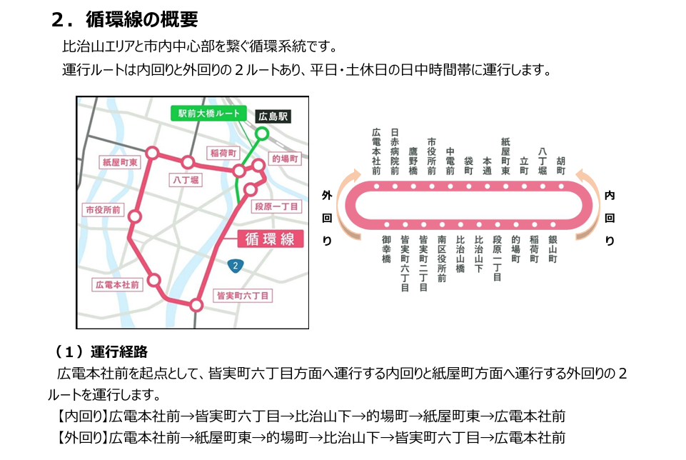 →皆実町六丁目→的場町→紙屋町東→広電本社前と逆方向に一周する内回りの2種類あります。