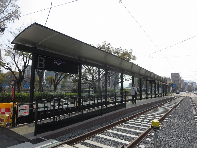 循環線のために、バリアフリー対応の立派な電停に造り替えられた的場町電停。